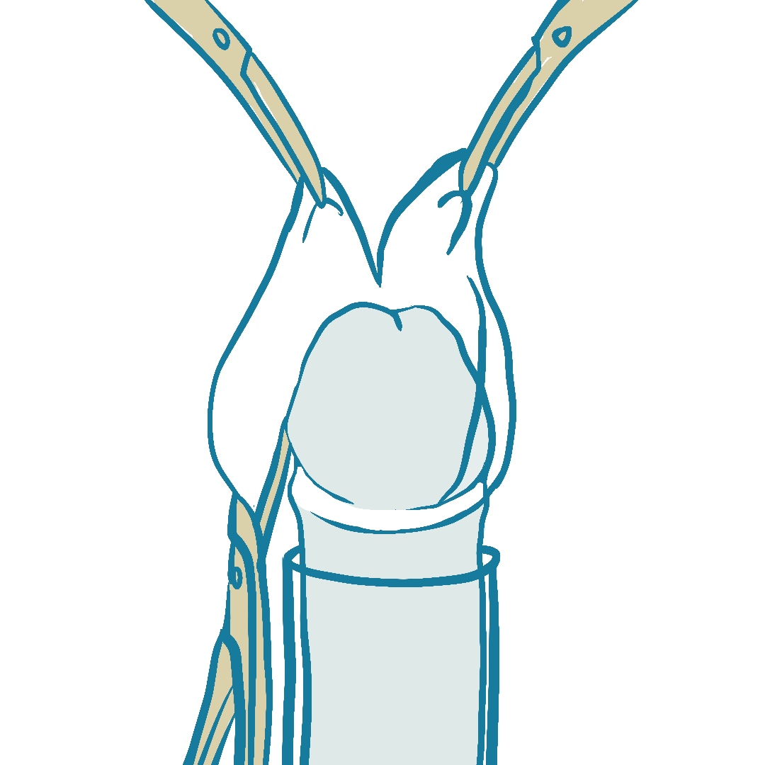 Wie in der Abbildung dargestellt, verwende ich die „dorsal slit“ Technik bei der Beschneidung. Zuvor werden an den markierten Stellen das innere und das äußere Blatt inzidiert, größere Venen unterbunden, kleinere Venen koaguliert. Bei Wunsch oder Verkürzung wird ebenfalls das Penisbändchen (Frenulum) von der Eichel vorsichtig gelöst, um die darunter befindlichen Nerven zu schonen. Eine komplette Entfernung des Bändchens ist nur bei massivem Hautüberschuss nötig.